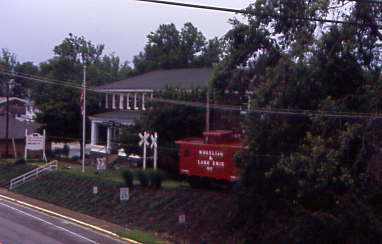 Wheeling and Lake Erie caboose 0217, built by the railroad in 1948. The building adjacent is the Wheeling and Lake Erie YMCA building which is now called the Wandle (Wheeling and Lake Erie) House, a museum and restaurant.