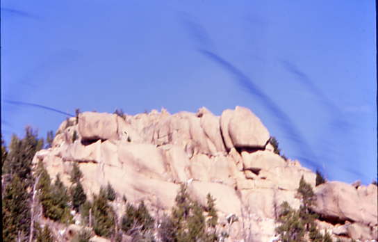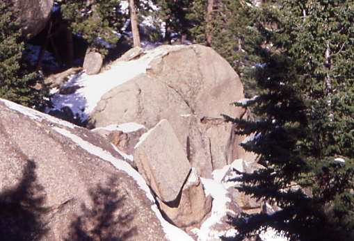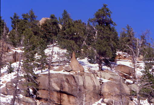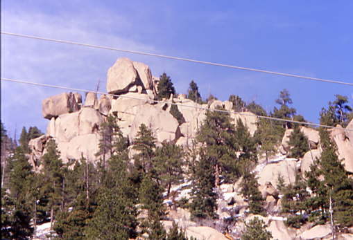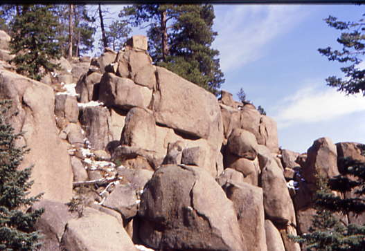 The short train departed at 1:20 PM while we waited for any last minute passengers. There was no morning run as the snow crews had to get out and open as much of the line towards the summit of Pikes Peak as they could. After all our passengers bboarded, we departed at 1:28 PM at 6,950 feet above sea level. Our route started climbing immediately as we passed the shop buildings then paralleled Ruxton Creek for the first few miles. The trees along here are Englemann Spruce. The tracks climbed steeply as we start passing through the first of the boulder fields.
