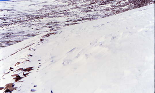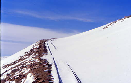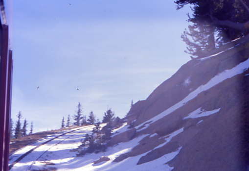 The tracks at Windy point with the snow ahead of our train.