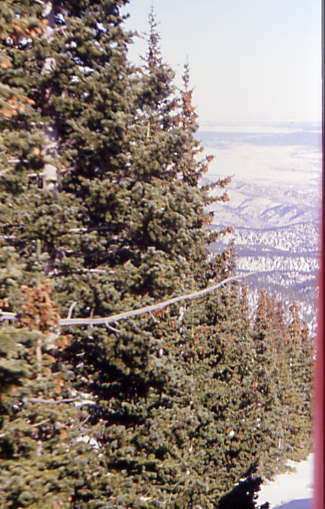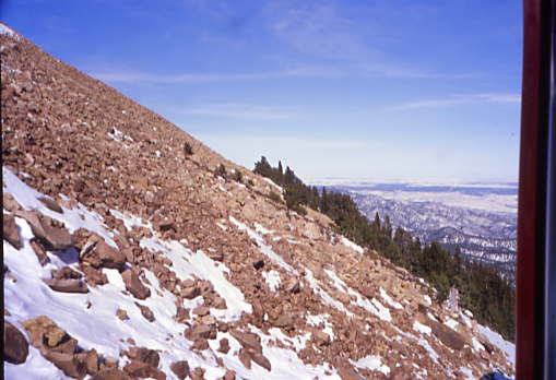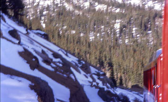 We continued climbing, reaching Deer Park before entering the longest straight track on the railroad where the water tank at Four Mile Siding is located. Further along this straight track was Mountain View at 10,000 feet before we turned and started up "The Hill" with a 24 percent grade. Below are views from the climbing of "The Hill".