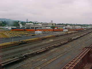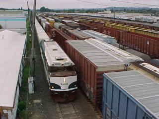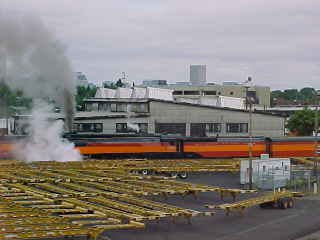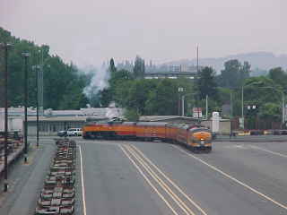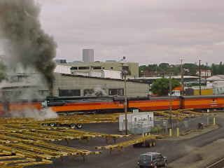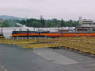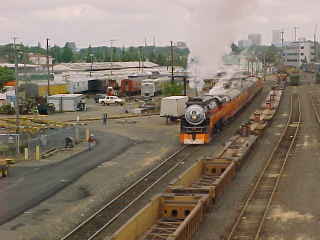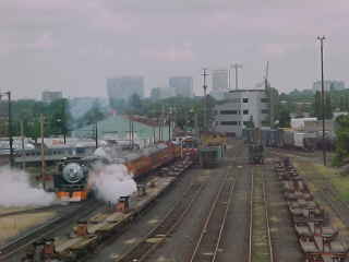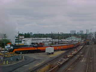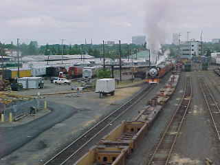 The four of us arose at 6:00 AM and were all in the car at 6:30 AM for the drive to the former Southern Pacific Brooklyn Yard. We drove 82nd Street south to Holgate Street and when we crossed the bridge over the yard, had our first view of Southern Pacific 4449 and its train. Jim parked the car before we walked up on the bridge.