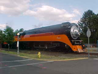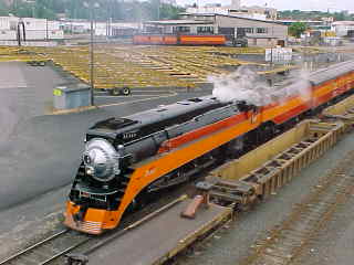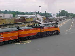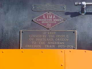 Southern Pacific 4-8-4 449Southern Pacific 4449 is the only surviving example of Southern Pacific Railroad's GS-4 class of steam locomotives. GS stands for "Golden State", a nickname for California (where the locomotive was operated in regular service), or "General Service". The locomotive was built by Lima Locomotive Works in Lima, Ohio in May 1941; it received the red-and-orange "Daylight" paint scheme for the passenger trains of the same name which it hauled for most of its service career. No. 4449 was retired from revenue service in 1957 and put into storage. In 1958 it was donated, by the railroad, to the City of Portland who then put it on static display in Oaks Park, where it remained until 1974. It was restored to operation for use in the second American Freedom Train, which toured the 48 contiguous United States for the American Bicentennial celebrations. Since then, 4449 has been operated in excursion service throughout the continental US; its operations are currently based at the Brooklyn roundhouse in Portland, where it is maintained by a group of dedicated volunteers called Friends of SP 4449. In 1983, a poll of Trains magazine readers chose the 4449 as the most popular locomotive in the nation.