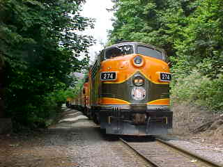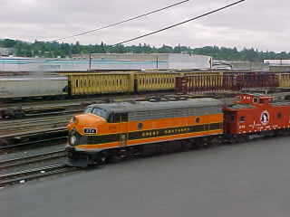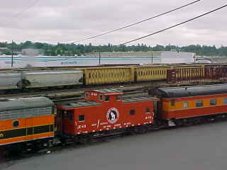On the rear of the train was Great Northern F7A 274, ex. Pete Replinger 274, exx. Seattle and North Coast 101, exxx. Burlington Northern 610, nee Great Northern 274B built by Electro-Motive Division in 1950.