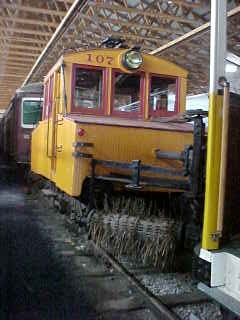 Scranton Transit Sweeper single-truck snow sweeper 107, a one-of-a-kind vehicle built by Chicago and Joliet Electric Railway in 1910 and is a four-wheeled car with rotating brooms at both ends. It is a "steeple cab" design with operator controls only in the middle. After the C&JER stopped operations in 1933, it went to Scranton until they stopped operating trolleys on December 18, 1954. Scranton snowsweeper 107 and passenger car 505 were taken to the Rail City museum in Sandy Pond, New York and ultimately to the Magee Transportation Museum in Bloomsburg, Pennsylvania. In 1972, Hurricane Agnes flooded the Magee museum, forcing its closing. Our Museum acquired 107 (and 505) in 1973. Sweeper 107 has been returned to operation at our museum and has been used many times to clear snow from the museum tracks.