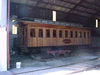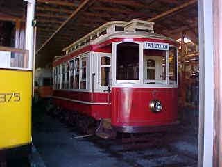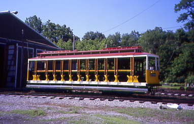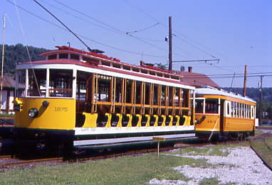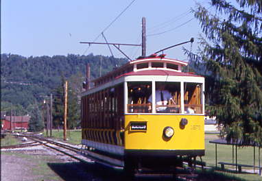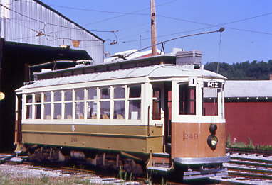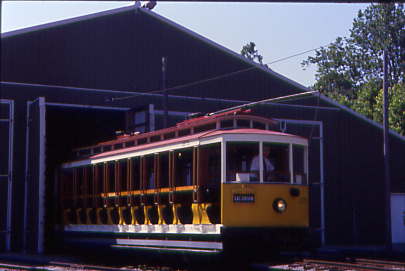 In front was S.T.C.P. Sociedade de Transportes Colectivos do Porto 'Maxi-traction' semi-convertible 249 built by Brill in 1904. The windows on this car can be raised into the roof of the car to create an airy 'open car' effect and coudl also be lowered quickly in the event of a rainstorm or cool weather. This Brill-built, designed and patented car is typical of thousands of similar small cars that operated around small town and through the streets of United States cities. Semi-convertible cars like 249 replaced convertible and open cars on many systems, because they could operate year-round. In 1924, car 249 was re-motorized with two motors and continued serving citizens of Porto until 1972, when it was retired. It was acquired by Rockhill Trolley Museum in October of that year. After being shipped across the Atlantic Ocean in a large wooden box, 249 was unloaded in Philadelphia and trucked to the museum. Unlike many other cars that have arrived at the museum needing years of costly restoration work, 249 arrived in good condition and entered regular service immediately.