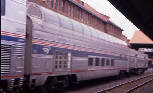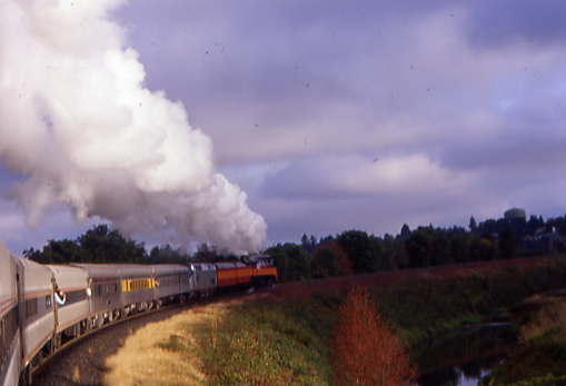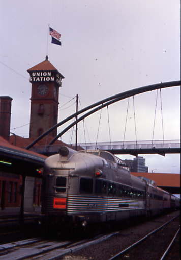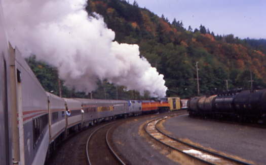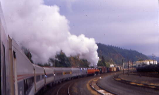 Amtrak's Great Dome was going to be part of our train, but here in Portland, the crew discovered five cracks in one of the trucks and it was bad-ordered. I learned during the trip that it would cost approximately $25,000 to repair, but it might need other work. I reboarded the train and relaxed at my seat then walked back to the "Pony Express" and waited for our on-time departure at 8:00 AM. As we left the station, there was a large group of well-wishers to see us off. I saw several photographers I knew who would be chasing the train for the next two days.