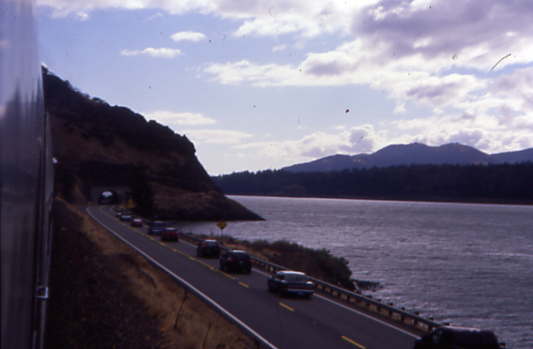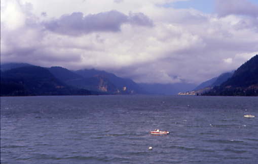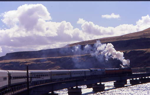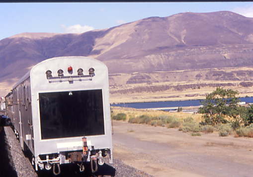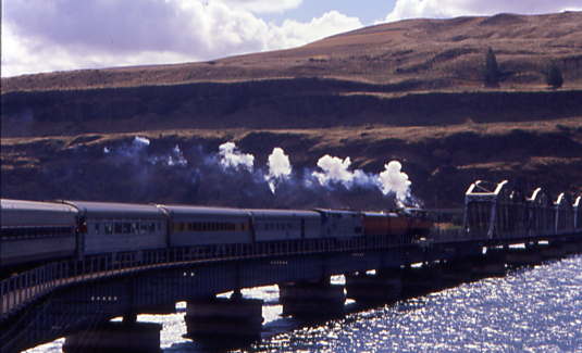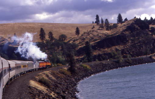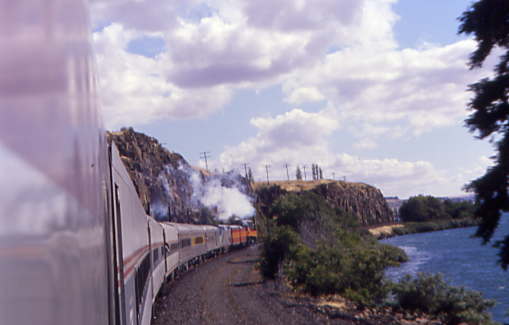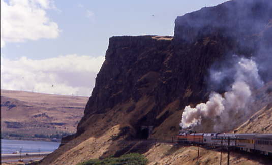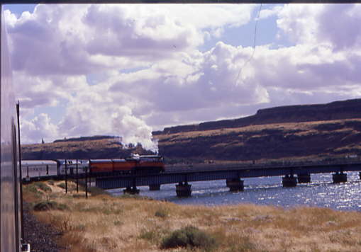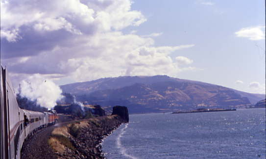 We returned to land as we curved off the bridge to make our station stop in Vancouver. In the "Pony Express", I met Richard Wilkins and we enjoyed conversation for quite a while. Southern Pacific 4449 ran east through Camas to the siding of Washougal, where I returned to my seat as we waited for the westbound Empire Builder. Once on the move east again, we passed through the 2,369 foot Cape Horn Tunnel and across the river, the 542 foot tall Multnomah Falls could be seen between the trees. We ran beneath the 840 foot tall Beacon Rock, which is the second largest monolith in the world before passing Bonneville Dam.