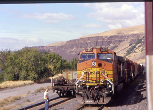 Southern Pacific 4449 met an eastbound freight at Avery with BNSF 4852 that would follow us across the Columbia River towards Bend.