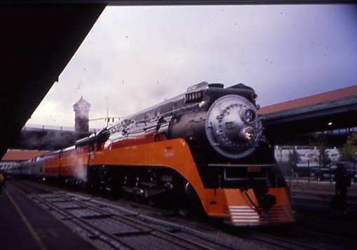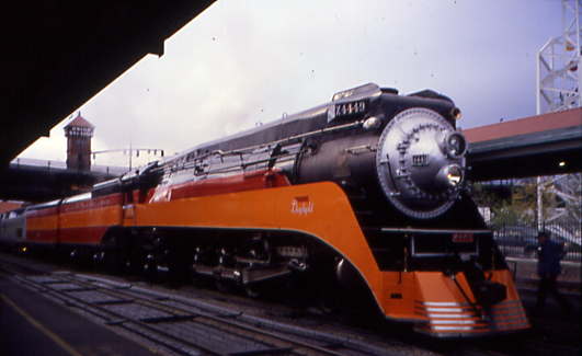 On Display: In 1958, when most of the GS class engines had already been scrapped, a then black-and-silver painted 4449 was removed from storage and donated to the city of Portland, Oregon, on April 24, 1958, where it was placed on outdoor public display in Oaks Park. Since the equipment was considered obsolete, 4449 was not actively chosen for static display. It was picked simply because it was the first in the dead line and could be removed with the least number of switching moves. During its time on display, 4449 was repeatedly vandalized and had many of its parts stolen, including its builder's plates and whistle. The locomotive quickly deteriorated due to neglect. It was evaluated for restoration in 1974 after becoming a candidate to pull the American Freedom Train. Its size, power, and graceful lines made it a good fit for the Bicentennial train. After finding that 4449's bearings and rods were in good shape, it was chosen.