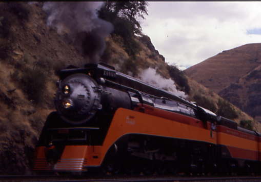 Southern Pacific 4449 ran next to Sherar's Falls, named after Joseph Sherar, a 19th century wagon road builder, on the river a few miles north of Maupin.