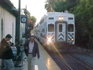 Pacific Surfliner 578 arrived nine minutes late and soon we were upstairs in the café/coach on our way to San Juan Capistrano. We made one stop at Irvine and twenty-two miles later, were stepping off the Pacific Surfliner. I bought a USA Today to read during our layover and near train time, we went to the north end of the platform to wait for Metrolink 609.