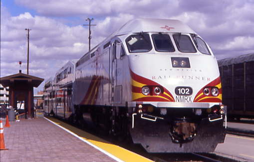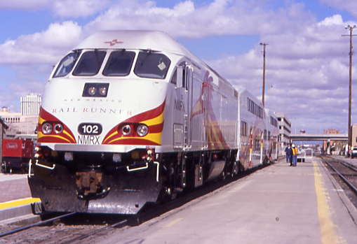 The New Mexico Rail Runner led by MP36PH-3C 102 built by Motive Power Industries in 2005.