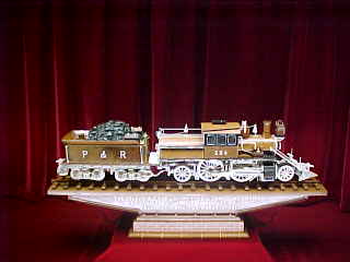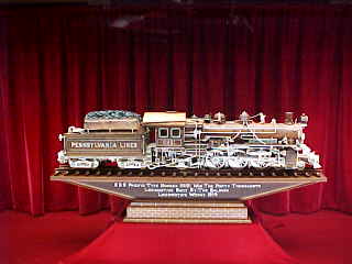 Pennslyvania Railroad 4-6-2 8661 Pacific type from the 1910s. Brown = wood, white = elephant ivory, black simulated coal = ebony wood, iridescent trim = abalone shell. This is a representation of a coal-burning steam locomotive. The original was built by the Baldwin Locomotive Company in 1913, which was the 40,000th locomotive built by them.