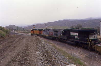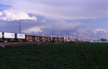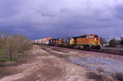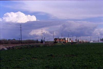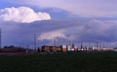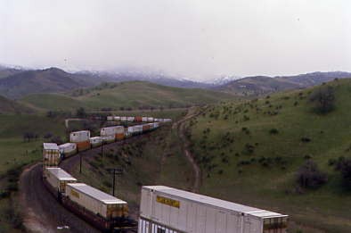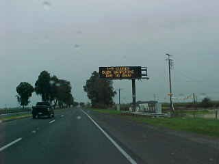 Further south was Union Pacific 5692 West. Continuing on the road south of Madera, we saw the first "Interstate 5 Closed Over Tejon Pass" sign and both wondered how California 58 over Tehachapi Pass was. We stopped for petrol just north of Fresno and acquired the phone number for road conditions. California Highway 58 was closed from 12 miles east of Bakersfield to Mojave. If it and Interstate 5 stayed closed all day, we would have to go home via Santa Maria, something both of us really did not want to do. We continued south and the next road condition sign was off but just south of Selma, the next sign was on.