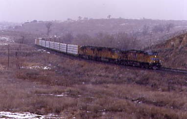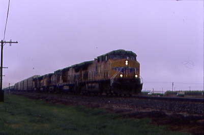 South of Merced during a light rain shower, we found Union Pacific 3878 West.
