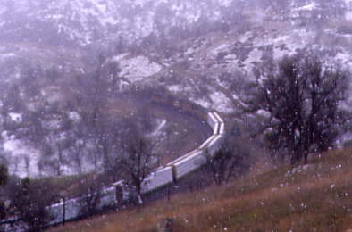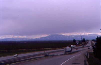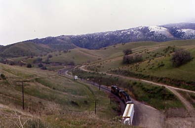 Train 901 before I spotted Chris across the parking lot. He had rented a Ford Crown Victoria, which is the same type of car that many police departments use. We drove north on Interstate 5 and listened to CDs that I brought. As we neared Gorman, we encountered snow flurries and were very happy to be just going through. Over the Summit and as far as Fort Tejon, the flurries continued then we dropped down the grade to Grapevine, where we paused to get some snacks before continuing north on Interstate 5 to California Highway 43, which we took north to Shafter.