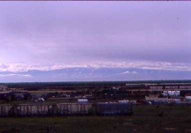 Almost to Bakersfield, we stopped for a pair of pictures of the snowy mountains ahead then called the road conditions line again and the California Highway Patrol was now escorting cars on Calfornia Highway 58, but Interstate 5 was still closed. We drove into Bakersfield to look for another Southern Pacific steam engine.
