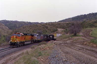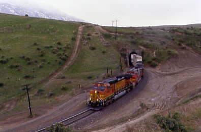 BNSF 5480 West exiting Tunnel 2 and descending down the grade. We tried again to get to the loop, but this time, spotted a westbound sitting at Cliff so drove to Bealville and I led Chris to near Tunnel 3.