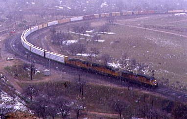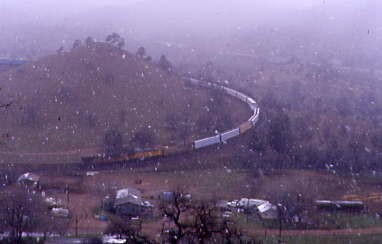 The power for our train at Tunnel 3. We drove up California Highway 58, spotting our eastbound Union Pacific again just before we pulled off at Keene. As we drove up the road towards the loop, we encountered a snowstorm so Chris parked near the Loop Monument and I led the way on a path on the hill that overlooks the loop as the snow continued to fall.