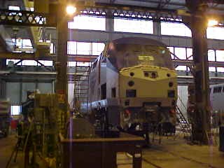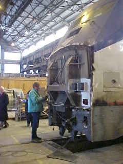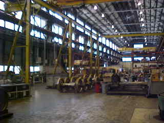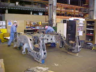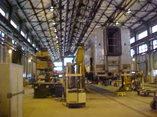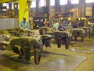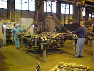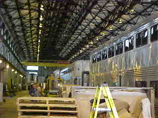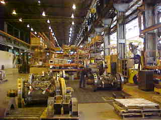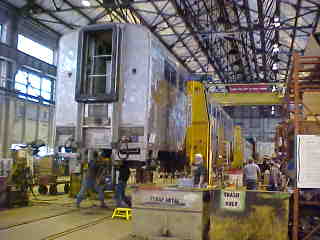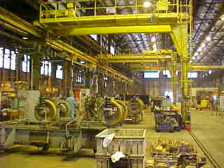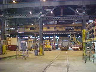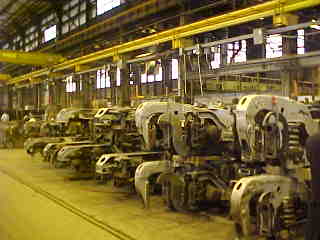 All cars in this shop are on shop trucks which allow them to move from one part to another while their trucks and wheels are being worked on in other parts of the shop complex.