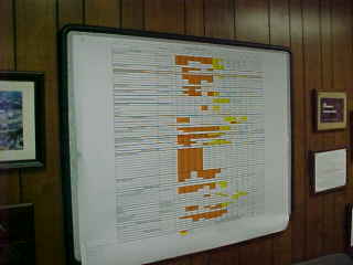 This is the PY07 Production Schedule. The orange tags means cars and engines that have been shipped out and returned to service, while the yellow tags indicate equipment that is in the shop for work. This schedule is updated weekly and we would see it in every shop building we visited. Beech Grove has 16 different programs, not including wrecks, while the Bear Mountain Shop only has three. We discussed the traction motor problems the locomotives have been having and the problem is with the pinion bearing. One thing Lew said is that this shop is really proud of the fact that they can make and create their own parts. One of this year's goals is to improve the air brake shop while another is to cut cycle time that equipment sits in the shop. When cars or locomotives are out of service, it costs the company $3,000 per day. Locomotives used to take 43 days but now, in most cases, are completed in 33 days. Painting using a quicker-drying paint takes two days to paint locomotives instead of three days. Production by the Beech Grove Shops has exceeded production quotas for four straight years.
