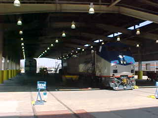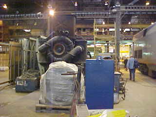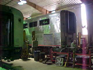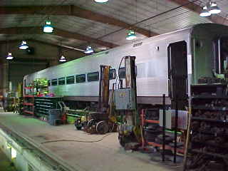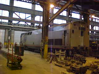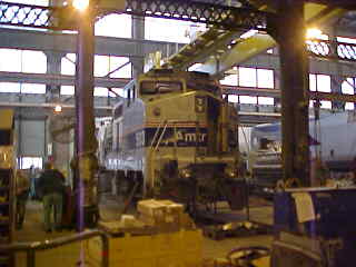 Inside the Hoist Shop was a Horizon car up on jacks. Amtrak may soon be repainting these cars to gray as their present aluminium sides attracts dirt as soon as the cars are released from Beech Grove.
