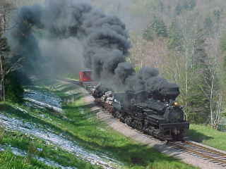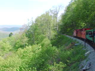 There was a fantastic view from Overlook, a great view from a perfectly-named place. We stopped briefly at Old Spruce and it was then announced that our first photo runbys would be held just before Spruce Junction. The original grade to Spruce could be seen along the stream below us. Our train passed the junction with the line to Bald Knob, a line I would have to come back and ride in the future.