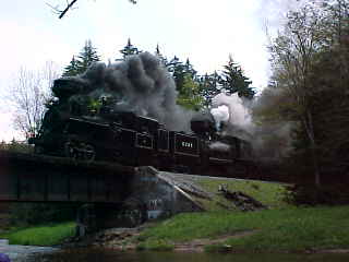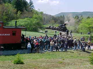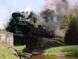 The train reversed up the grade along the Shaver Fork of the Cheat River. When we reached the North Bridge of the Twin Bridges, the rear four carloads of passengers detrained for the photo runbys there. The front part of the train would go to the South Bridge for their runbys.
