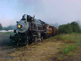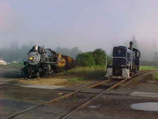 The two engines which will come into play today. I checked in and signed my release for the trip before purchasing the DVD "Chasing the Portland Rose Tour and the Puget Sound Steam Special" featuring steam engines Union Pacific 844 and Southern Pacific 4449 that Joe Harper had filmed, covering over 1,400 trackside miles. I had some maple bars and bought a T-shirt form the Chelatchie Prairie Railroad gift shop. At 7:50 AM, we had a group meeting about the trip, safety and other items people needed to know. Joe introduced me to the group as having completed a million rail miles. We all then walked in front of the station to set up for our first photo runby of the day.