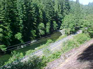 The East Fork of the Lewis River far below us at this point. We reboarded once more and crossed the bridge across the Lewis River to the next location. Once we arrived here, the lighting was all wrong but it was decided to proceed with the runby then take the train back to Yacolt to wye the engine and rearrange the cars so that the engine would be on the north end of the train for the rest of the day.
