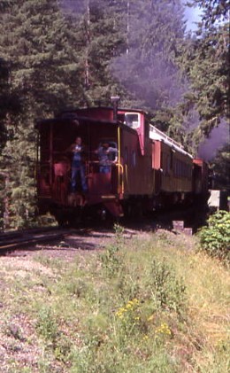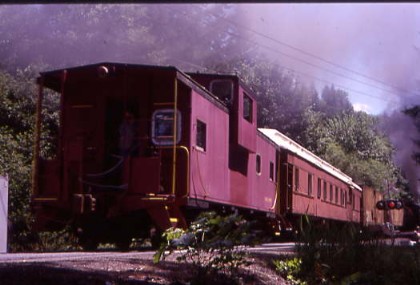 The reverse move to position our train for loading. We all boarded the train with the three of us taking up one side of the cupola in the caboose.