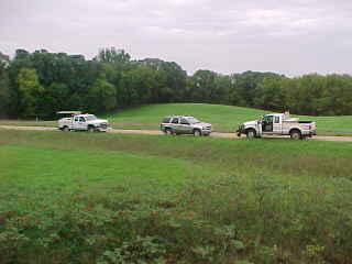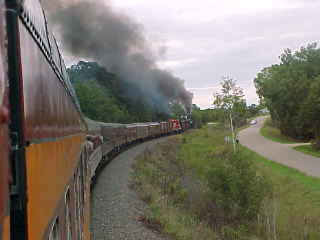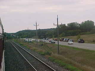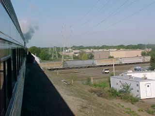 Lake Sarah was off to the south of the train, while on Highway 55, the pacers were providing plenty of entertainment. We steamed through Rockford and crossed high over the Crow River, followed by travelling across the green rolling countryside and the 9,200 foot siding at Dickinson.