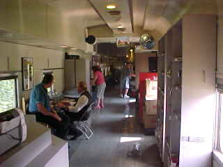 Interior of Great Smoky Mountains kitchen-dormitory 8807 "Conductor's Cafe", ex. Amtrak 8807, exx. Penn Central 4623, nee Pennsylvania Railroad 4623, built by Budd Company in 1949.