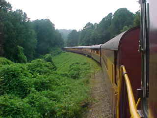 Entering Cowee tunnel. In the late 1800;s, the far western mountain people were cut off from the opportunities of prosperity that were available in the eastern part of the state. The railroad brought increasing commerce to the mountain people in what was mostly wilderness at the time. If the Cowee mountain tunnel on the Western North Carolina Railroad Company line had not been dug, Dillsboro would have been the end of the hope for more reliable transportation for people and commodities west of Jackson, Macon, and Swain counties. When the new rail line construction reached Dillsboro, 500 black convicts on the so-called "chain gang" from the state prison system of North Carolina were leased to the railroad to excavate, by hand-drilling, the ridge of solid rock the company ran into there.