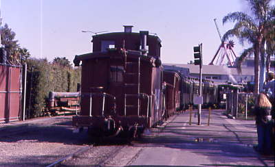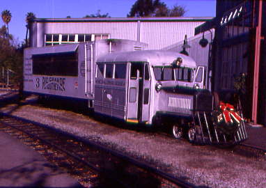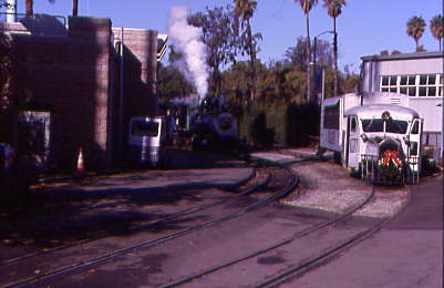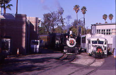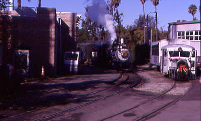 This year's Pacific Railroad Society banquet was being held at Knott's Berry Farm in Buena Park, California. A shop tour was being offered at 10:00 AM, so I signed up and that morning, drove to Knott's Berry Farm and paid ten dollars to park then walked to the front entrance where I found Carole Walker, who was joining me. A few more PRS members soon arrived and we spotted the Knott's train crew. Once the rest of our group gathered, we were led into the park and in a short time, we arrived at the shops just as the train was approaching.