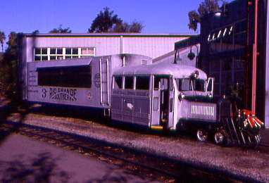 Rio Grande Southern Galloping Goose 3 which has a Wayne Bus body and was constructed in 1931 and is fifty percent heavier than 2 and longer. She is the first Goose running on three trucks (the middle one being powered) and to be articulated. She is mostly made of 1926 Pierce-Arrow parts for the body of the passenger section and for the engine.