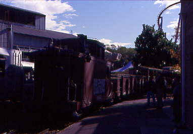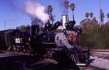 The park train at the Ghost Town station. Our group then rode the train around the park and went to the Hacienda Room for the PRS Banquet. Following the serving of Mrs. Knott's Famous Chicken Dinner, door prizes were announced and I won an American Freedom Train Poster that I would donate to the Depot Inn and Suites in La Plata, Missouri. Russ Davies presented a slide show on Railroading in Colorado Through the Years. After the banquet, Carole and I then stood in a line for 42 minutes to ride the Calico Mine Train, which I had forgotten how enjoyable it was. With that, our visit to Knott's Berry Farm was complete.