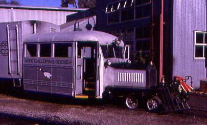The Galloping Geese were built by the Rio Grande Southern shops in Ridgway, with very little means and a lot of ingenuity, from whatever material was available, spare car parts and other used parts. There are several hypothesis regarding the origin of the weird unofficial nickname (Galloping Goose) of the Motors. One of them claims that the name came from the waddling of the Geese on the uneven Rio Grande Southern track, another attributed the nickname to the goose-like honk of the horn of the Motors, very different from the usual whistle of steam engines. All the Geese have survived until now, except one (of which a replica has been built). Among the survivors, all but one are operational and are used occasionally on the loop track of the Colorado Railroad Museum, on the Cumbres & Toltec or on the Durango & Silverton.