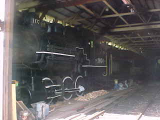 Inside the shop was Lake Whatcom Railway 0-6-0 1070, ex. Frank Culp 1962, exx. Edward Campbell 1959, exxx. Simpson Timber Company 1070, nee Northern Pacific 1070, built by American Locomotive Company in 1907. Also here were Northern Pacific parlour-observation car "Madison River", wooden caboose 10869 and coaches 1512 and 627.