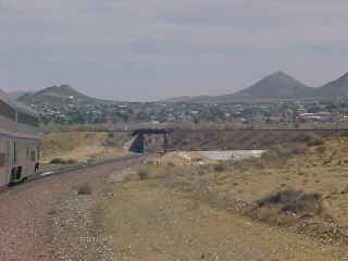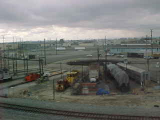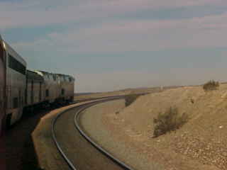 Looking back at the red mesas. Next was Blue Oyster Cult's "Curse of the Hidden Mirror". At Suwanee, we were stopped by a westbound BNSF train before crossing over to the south track and continuing east. My next musical selection was Rush's "Vapor Trails". We arrived at Albuquerque fifteen minutes early, where I detrained into a cold and windy 36 degree afternoon and called Let's Talk Trains, the Internet radio show. I learned that my westbound train was delayed by a dust storm and would not arrive until 7:30 tonight so there was no need to worry about making my connections in Lamy.