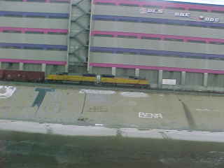 A Union Pacific freight along the east bank of the Los Angeles River.
