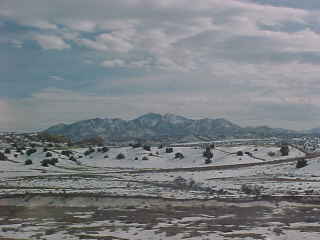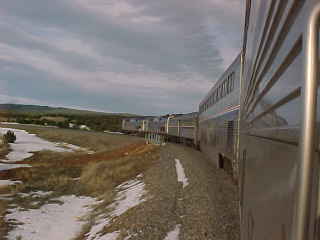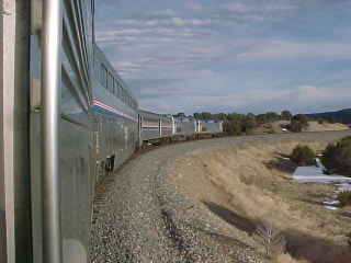 Passing the on-time westbound Southwest Chief as we took the siding at Waldo. As we left Lamy, I switched to the Rolling Stones' "Bridges to Babylon." We climbed through snow-covered Apache Canyon then up and over Glorieta Pass. Rob Quist and Jack Gladstone's "Odyssey West" was my next musical choice of the afternoon.