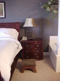 In one corner is a desk and nighstand complete with drawers and a lamp.