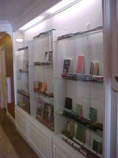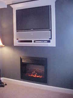 To the right of that, mounted in a bookcase, is a big-screen television set.