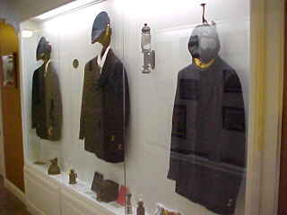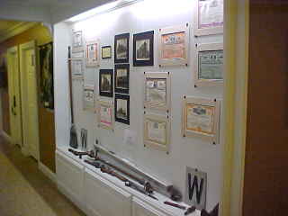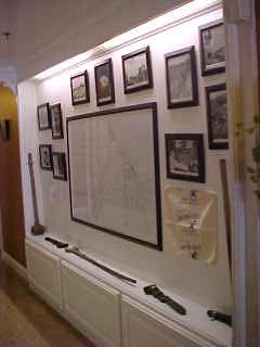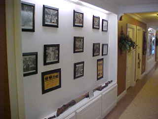 Finally, there is a very comfortable couch with a tall lamp next to it. That is the Pullman Suite. Now I will describe the interior of the hotel which features a long hallway with various railroad displays on each side.