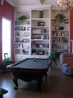 A pool table in one corner and behind it, a selection of books, including some on railroads, that guests can read during their stay.