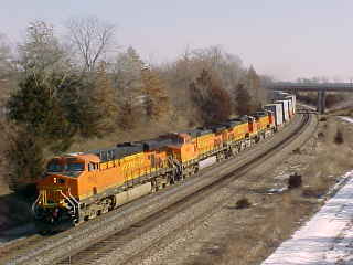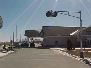 2/11/2007 I slept so well in that bed that I did not awake until 8:30 AM, which is considered very late for me. Looking out of my window, after a great shower, I saw more sunny skies then called Julie, Amtrak's automated agent, to learn how the eastbound Southwest Chief was doing today as I wanted to take a picture of it here. She had it arriving at 10:20 AM so I walked over to the Red Rooster for breakfast, passing the Bank of La Plata sign that read 26 degrees, with a southwest wind blowing the flags. I ordered waffles and sausage patties and after breakfast, returned to my room and watched ESPN Sports Center before walking down to the road bridge that crosses over the BNSF mainline. It is a few minutes walk and offers a great view of the tracks.