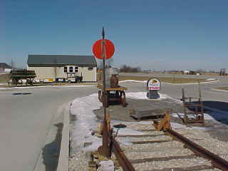 By the entrance, there is a derailer at the end of a track panel along with a tool car.