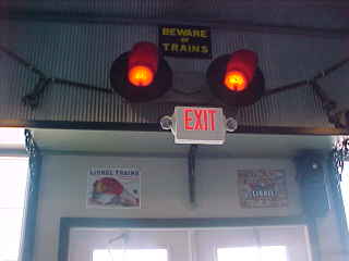 A railroad crossing signal at the south end of the building. The eaves of the building read "northbound, eastbound, southbound and westbound".