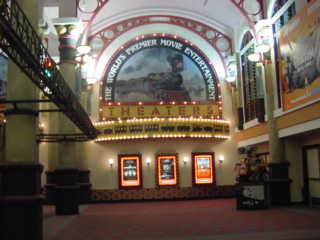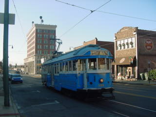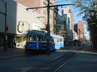 After lunch I went to Peabody Place and found a very interesting Muvico Movie Theater with a real railroad theme. Inside were wall paintings on both sides with two massive 2-6-6-4's passing another train's caboose, very impressive. I saw "National Treasure: Book of Secrets" and learned at the end that Trevor Rabin, the former Yes guitar player, recorded the soundtrack. It was a fantastic film, then during my walk back to Vance Park, saw a Riverfront Loop streetcar on its way south and went to the Beale Street station to wait for the next one. Ten minutes passed then the crossing gates went down and here it came.